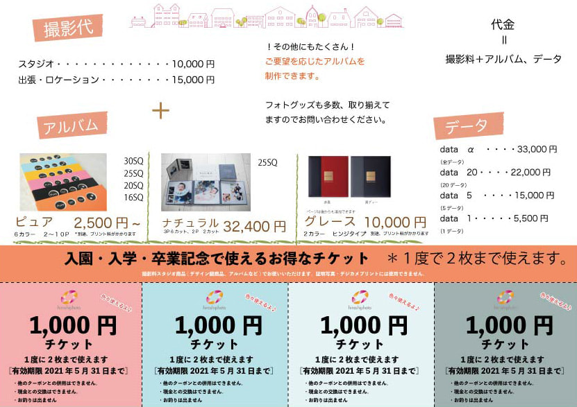 チラシをお持ちいただくか、来店の際にホームページをご覧になった旨を伝えていただければクーポンを適用していただいてお得に撮影ができます。