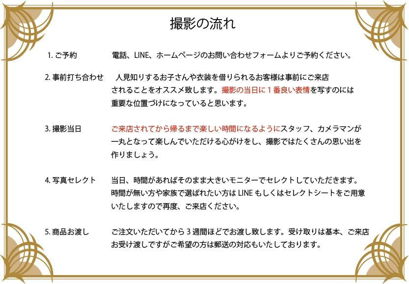 完全予約制になっております。待ち時間がなくゆっくり撮影を楽しんでいただく為にもオススメしております。 |