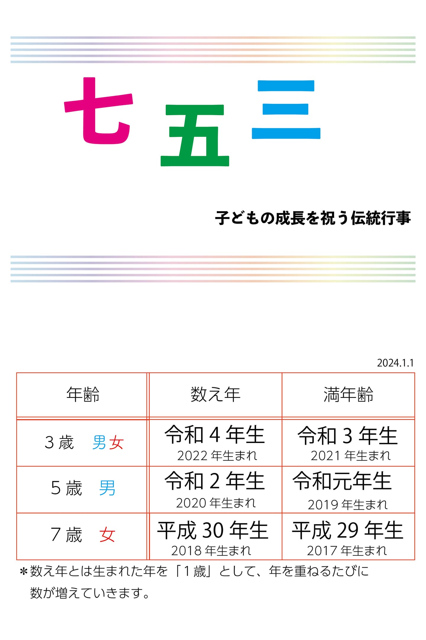数え年3歳(満年齢2歳になる年)を「髪置きの儀」とし、男女とも行う。江戸時代は、3歳までは髪を剃る習慣があったため、それを終了する儀。